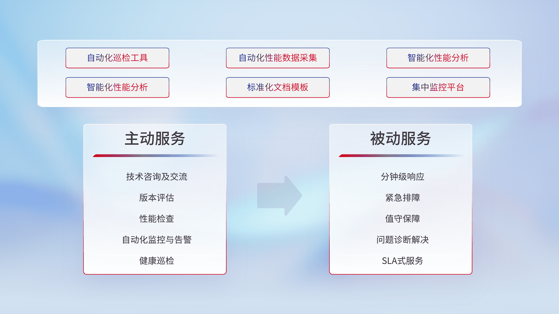 智能化工具和标准化文档,,,保障服务质量,,提供主动服务(包含技术咨询、、、版本评估、、、、性能检查、、自动化监控与告警、、、健康巡检)和被动服务包含(分钟级响应、、、、紧急排障、、、、值守保障、、、问题诊断解决、、、、SLA服务)。。。